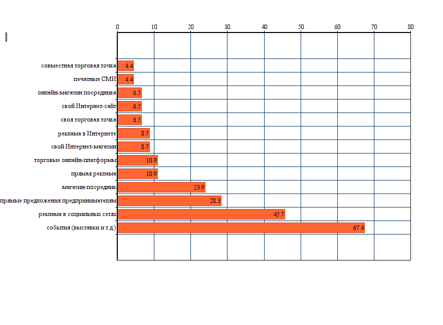 Еще 4 чел. (8,7%) написали, что они рекламируют и продают свою продукцию «через знакомых». Явно лидируют в способах продвижения и продажи «события (выставки, ярмарки и пр.)» (67,4%). В целом, обращает на себя внимание невысокая доля размещающих свою рекламу в социальных сетях (45,7%), и достаточно низкая — через другие Интернет-ресурсы (10,9% и менее). На третьем и четвертом местах по популярности идут «прямые предложения другим предпринимателям» (28,3%) и реклама (продажи) через магазин-посредник (28,3%).