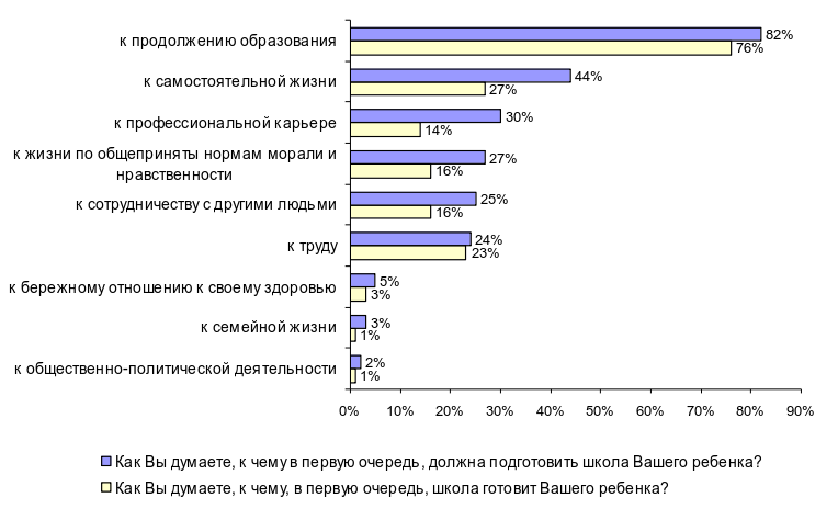 Таким образом, на взгляд родителей, школа практически реализует их ожидания по отношению к подготовке школой ребенка к труду и к продолжению образования. Меньше, чем хотелось бы родителям, школа готовит выпускника к самостоятельной жизни (на 17% меньше, чем ожидают), к профессиональной карьере (на 16% меньше), к жизни по нормам морали и нравственности (на 11% меньше), к сотрудничеству с другими людьми (на 9% меньше, чем ожидают).