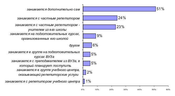 • их дети активнее занимаются дополнительно по школьным предметам (56,7% при 42,2% в среднем), причем существенно чаще им помогает либо частный репетитор (20% при 10,6% в среднем), либо преподаватель ВУЗа (8,1% при 2,3% в среднем), либо подготовительные курсы ВУЗа (8,1% при 2% в среднем);
