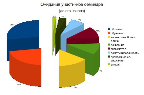 Поскольку в ожиданиях коммуникативные запросы (пообщаться, познакомиться, сплотиться) преобладают над содержательными и обучающими запросами, данные результаты подтверждают актуальность запроса на проведение семинаров корпоративного развития.