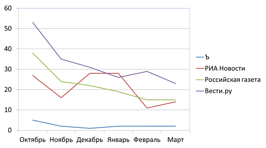 Как видно из графика, максимальное число упоминаний приходится на октябрь 2013 года. Такой результат, скорее всего, связан с всплеском интереса к Карелии после неожиданных результатов выборов мэра Петрозаводска в сентябре 2013 года. В ноябре 2013 года число публикаций о Карелии сократилось: в «РИА Новости» снижение составило 40%, у «Российской газеты» снижение составило 37%, у «Вестей» – 34%.