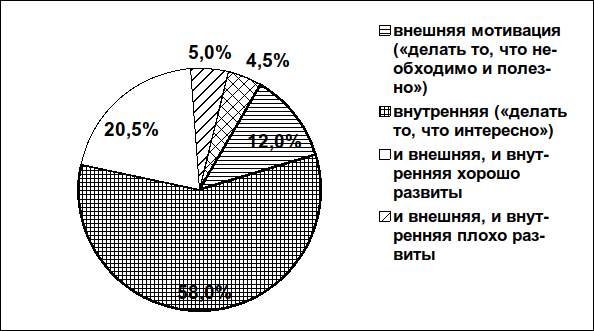 Одни из самых интересных данных касались оценки родителями преобладания у их детей того или иного типа мотивации. Большинство респондентов (58%) считает, что у их детей лучше развита внутренняя мотивация (см. Рис. 1).
