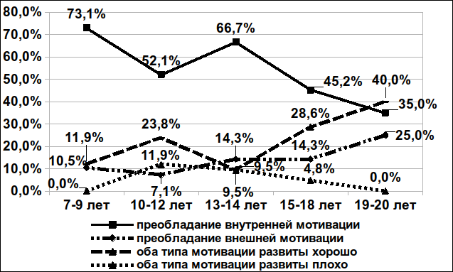 У детей в возрасте 7-9 лет о преобладании внутренней мотивации пишут 71% родителей, о преобладании внешней мотивации — 11,6%; о хорошем развитии обоих видов — 13%, а о плохом развитии внутренней и внешней мотивации — никто (0%). В возрасте 10-12 лет лидирование внутренней мотивации уменьшается до 55,6%, а лидирование внешней мотивации также несколько уменьшается до 6,7%. Зато до 22,2% растет доля тех, у кого, по мнению родителей, хорошо развиты оба вида мотивации, но и появляется доля тех, у кого оба вида развиты плохо (11,1%). В следующем возрасте (13-14 лет) мы наблюдаем обратный рост долей детей с лидирующей внутренней мотивацией (70,8%) или лидирующей внешней мотивацией (12,5%). Серьезно падает доля детей с хорошим развитием обоих видов мотивации (8,3%), зато несколько падает и доля детей с плохим развитием обоих видов (8,3%). Далее мы наблюдаем следующие тенденции: к 19-20 годам достигает максимума доля детей с лидированием внешней мотивации (25%; в 15-18 лет — 14,3%), а минимума — доля детей с лидированием внутренней мотивации (35%; в 15-17 лет — 45,2%). Также максимума к 19-20 годам, достигает и доля тех детей, у кого, по мнению их родителей, хорошо развиты оба вида мотивации (40%; в 15-18 лет — 28,6%). В 19-20 лет снова исчезает доля тех, у кого оба вида мотивации развита плохо (в 15-18 лет — 4,8%).